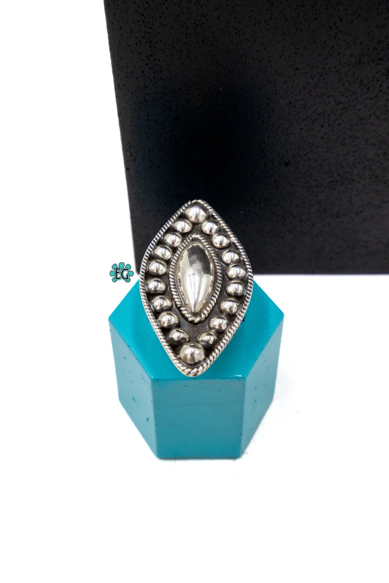 - Oxidized Dot Accents Surround a Marquise‑Shaped Face
